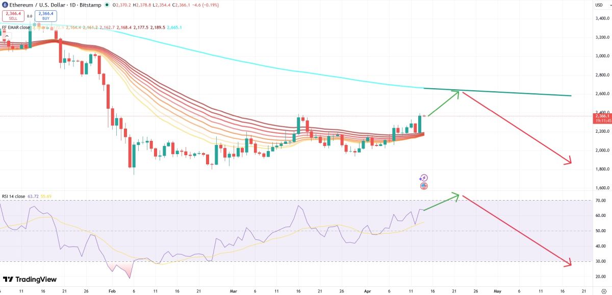 Si l’histoire se répète, le prix de l’ETH continuera d’augmenter. Le prix de cet actif devrait atteindre la moyenne mobile exponentielle à 200 jours, actuellement à 2 672 $. Dans ce cas, le RSI se situera en zone de surachat, ce qui entraînera un retournement de tendance. kriptovalyuta redeviendra beaucoup moins cher.